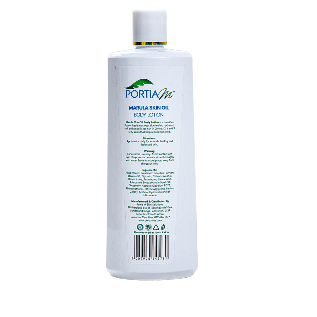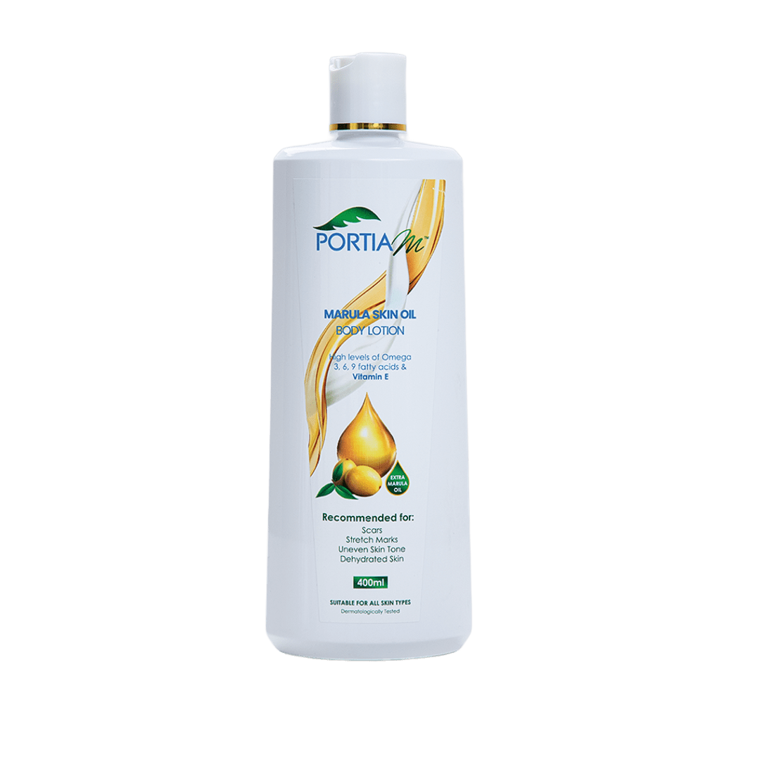 Portia M Marula Skin Body Lotion 400ml contains high levels of Omega 3, 6 and 9 fatty acids which moisturise the skin. Adds nourishment to dehydrated skin and evens your skin tone leaving it looking smooth and healthy.