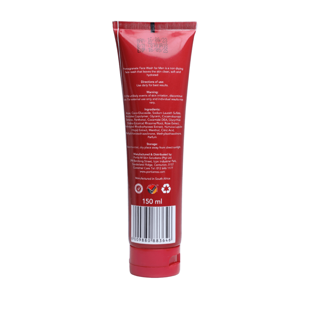 Portia M Male Facewash Pomegranate 150ml with hops and liquorice is ideal for all skin types. Use daily to cleanse and nourish the skin.