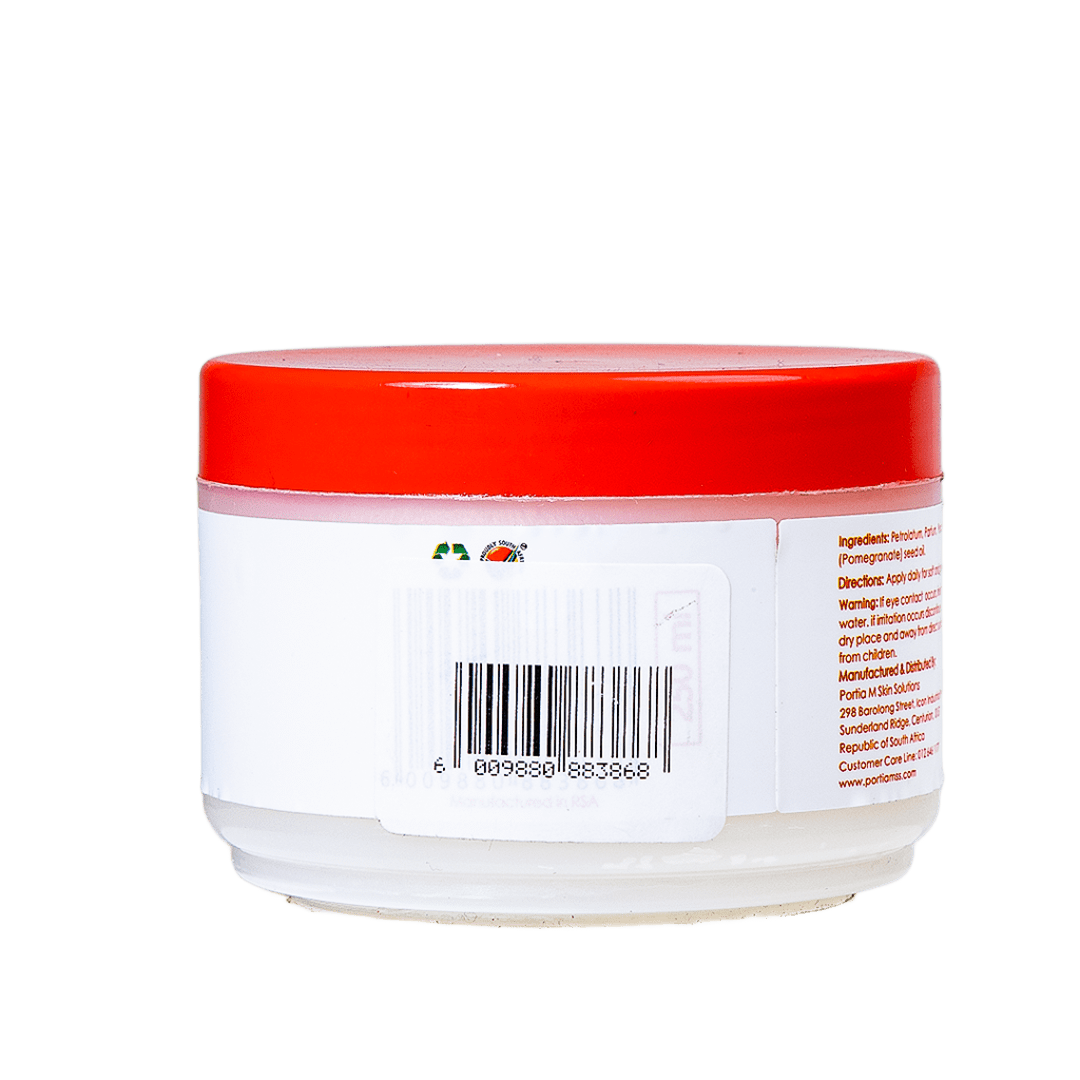 The Portia M Pomegranate Infused Petroleum jelly formulated to hydrate , seal in the moisture , create a protective barrier for the skin to retain moisture.